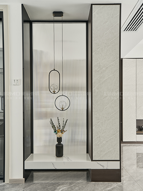 可以放置鑰匙包包等物品。玄關(guān)長虹半透玻璃結(jié)合柜體穿插設(shè)計,更顯時尚。