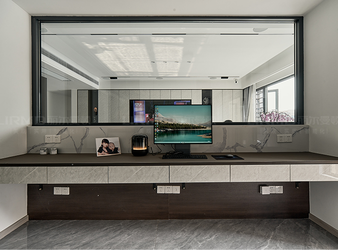 砸墻做半墻玻璃,書房客廳更加通透,超長書桌設(shè)計加正面書柜設(shè)計,學習辦公兩不誤。