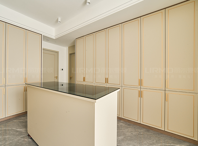 U字型設(shè)計,柜子象牙灰色鑲嵌金屬邊框,分段造型柜門設(shè)計僅限優(yōu)雅檔次,