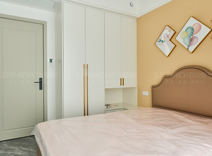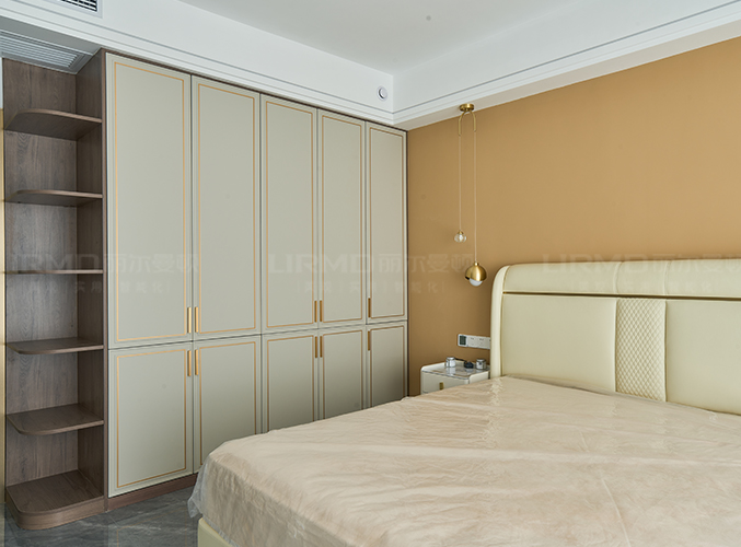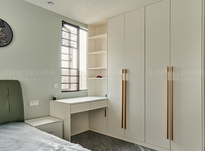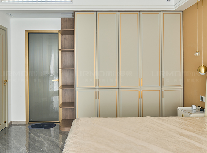 整面墻做衣柜,更加好分類,柜子象牙灰色鑲嵌金屬邊框,側(cè)邊做一個圓弧角處理,