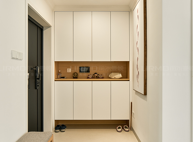 18mm厚杉木芯板,實木柜體搭配PET膚感柜門,可作為鞋柜/衣柜/收納區,