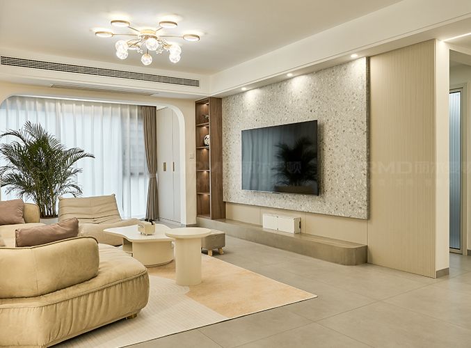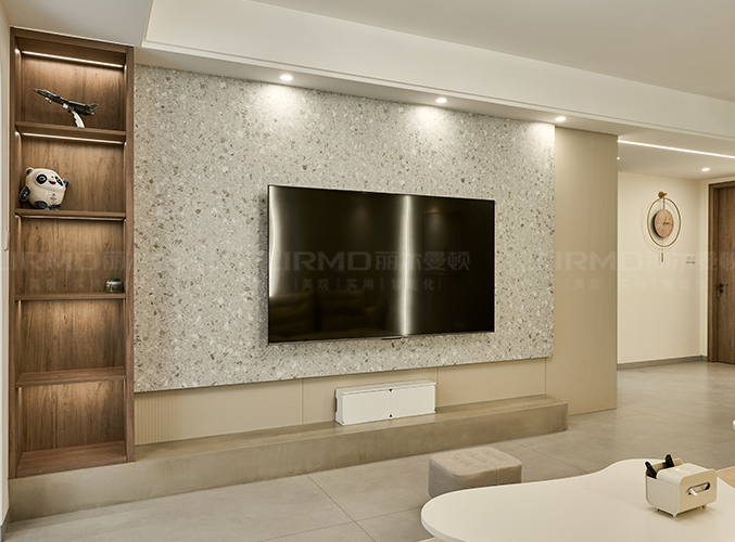 電視背景墻整墻設計,左側柜子可以放置小物品和喜歡的綠植。