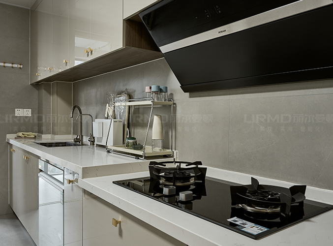 立面簡致,紋理細膩,增加了瓷磚防油漆,上方有餐柜,視覺層次更加豐富,