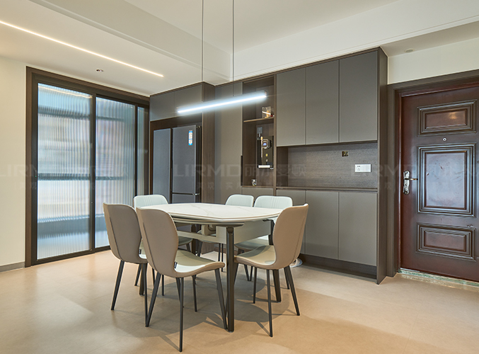 餐廳做同款餐邊柜,入戶收納+飲水機(jī)+冰箱實(shí)現(xiàn)多功能化,中間預(yù)留管線設(shè)計(jì),下方懸空設(shè)計(jì),