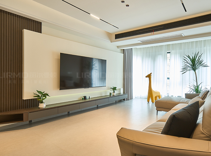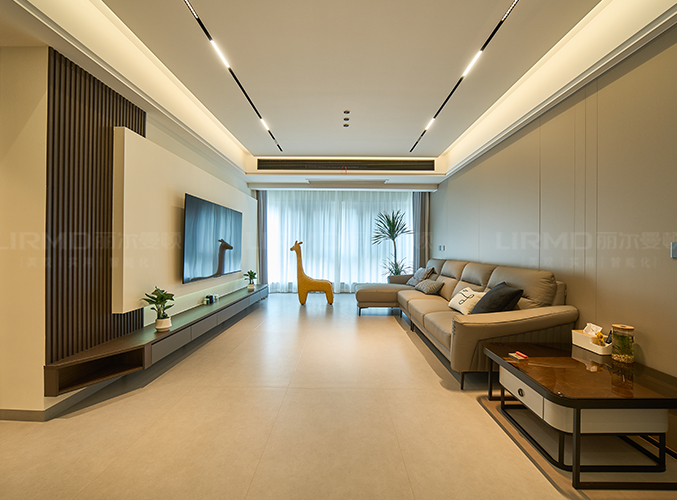 整墻做電視背景懸浮柜,整體灰色系基調(diào)搭配無主燈設(shè)計(jì),線性燈帶營造滿滿高級(jí)感。