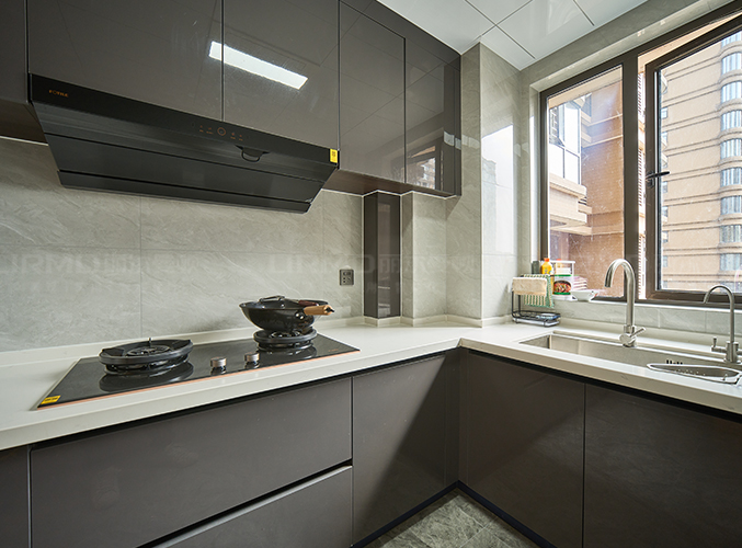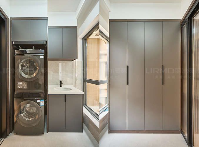 陽臺(tái)洗烘干一體化組合柜,深灰膚感飾面柜門質(zhì)感十足。