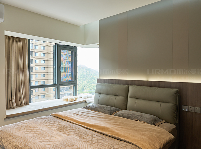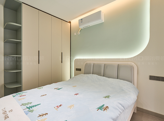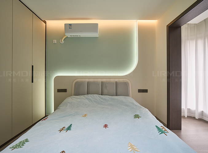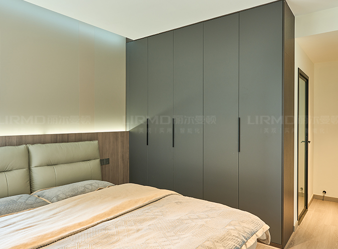 主臥延續(xù)低飽和度色系+深灰色一柜到頂衣柜,床頭裝木紋板搭配暖色氛圍燈烘托安靜柔和的氛圍,