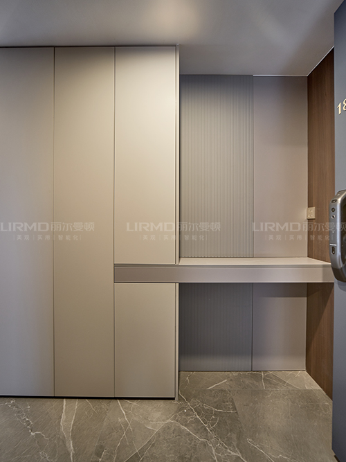 實木柜體搭配PET膚感柜門,一門到頂柜子設計+右側懸空桌臺設計,下方懸空設計,