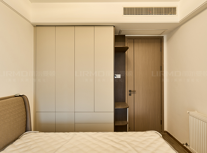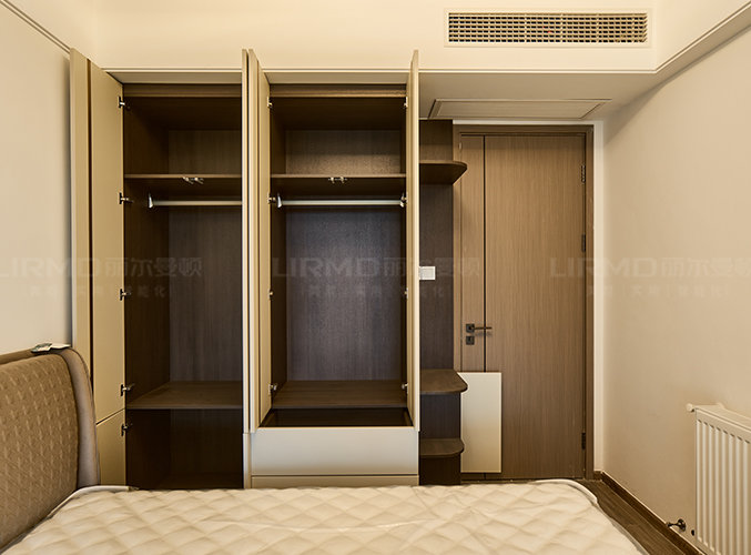 衣帽間做L型衣柜+一門到頂設計,三面柜門做落地穿衣鏡功能性十足。