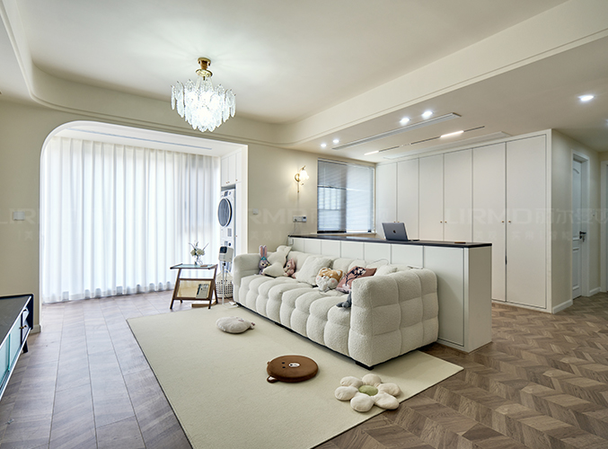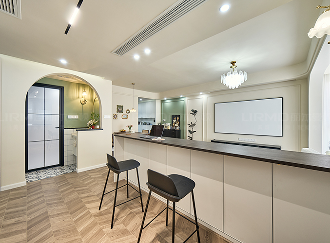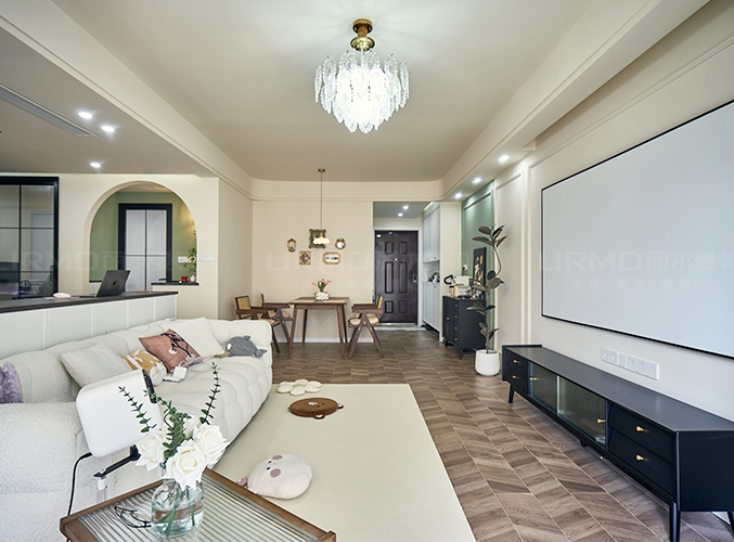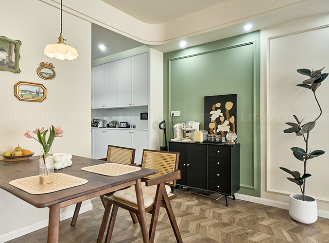 整體奶油色墻漆搭配橄欖綠,地面拼接魚骨木地板,營造清新舒適氛圍,吊燈設計,