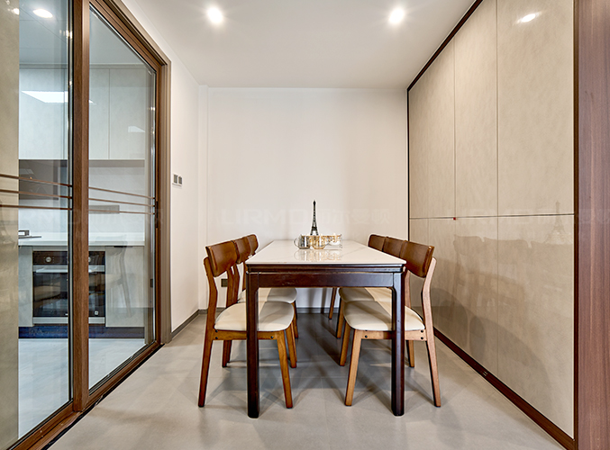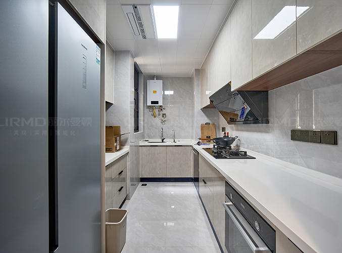 上下方都有收納柜,視覺層次更加豐富,搭配大理石臺面美觀又實用,內嵌式冰箱設計,不占空間。