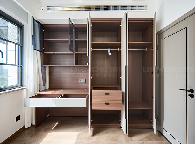 滿墻衣柜+同色系背景墻,超大陽臺放置梳妝臺采光一流,衣柜+書桌一體設計,儲物學習更方便。