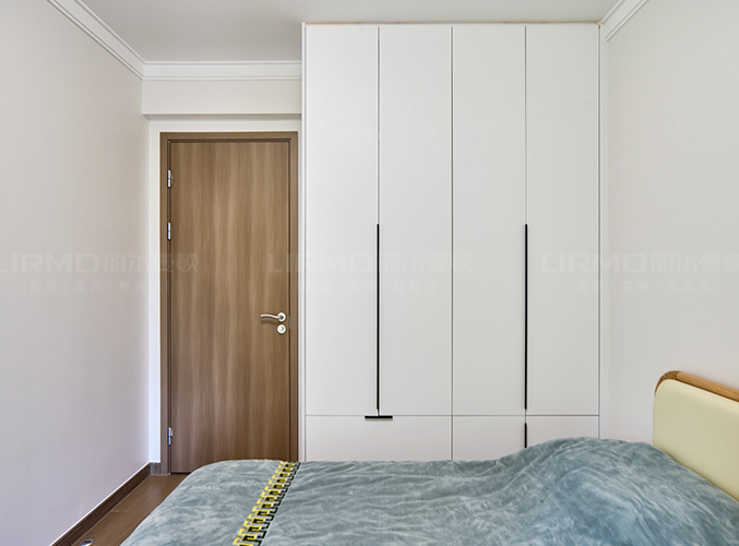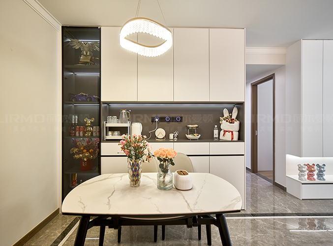 白色答題時(shí)搭配木紋柜子,暖色燈光讓氛圍溫馨清爽。