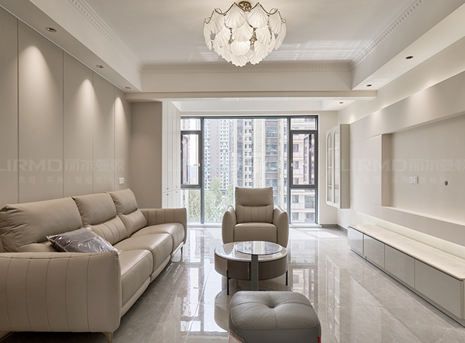 整塊墻做電視背景墻,盡顯大氣,電視內嵌設計,不占空間,吊燈設計,增強照明實用性的