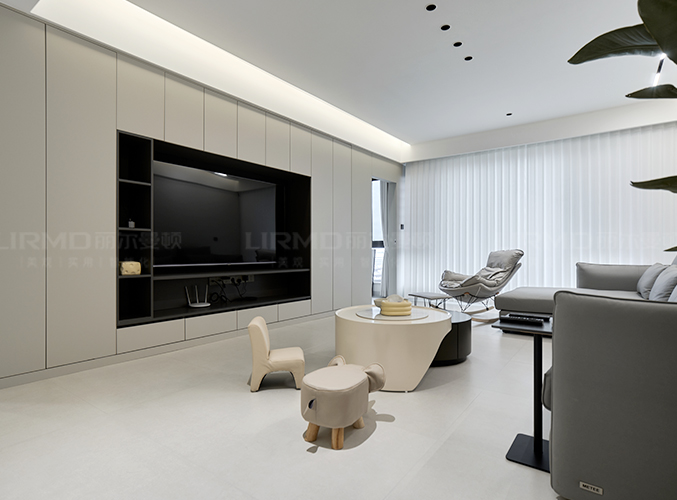整屋通鋪瓷磚,整墻電視背景墻設(shè)計(jì),左邊內(nèi)嵌式柜子,可擺放綠植和小物件,