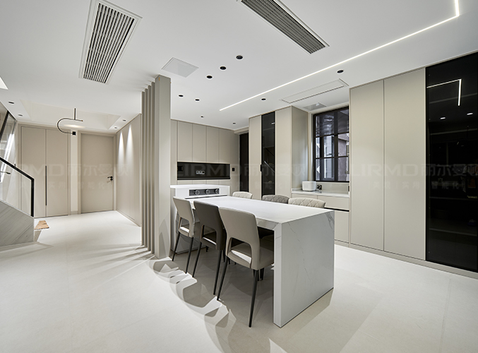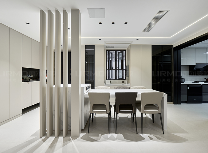 餐廳整墻做餐邊柜,島臺(tái)餐桌一體,可推拉調(diào)節(jié)餐桌長度,滿足多人聚餐需求。