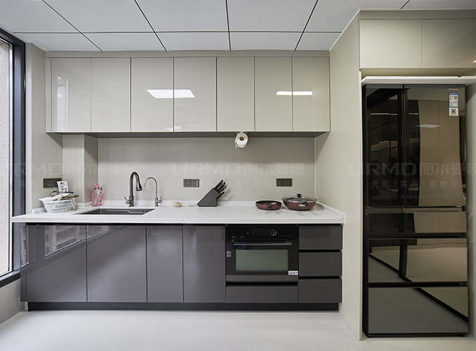 上下方都有收納柜,視覺層次更加豐富,搭配大理石臺(tái)面美觀又實(shí)用,內(nèi)嵌式冰箱不占空間。