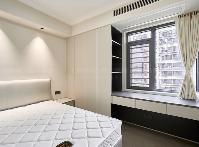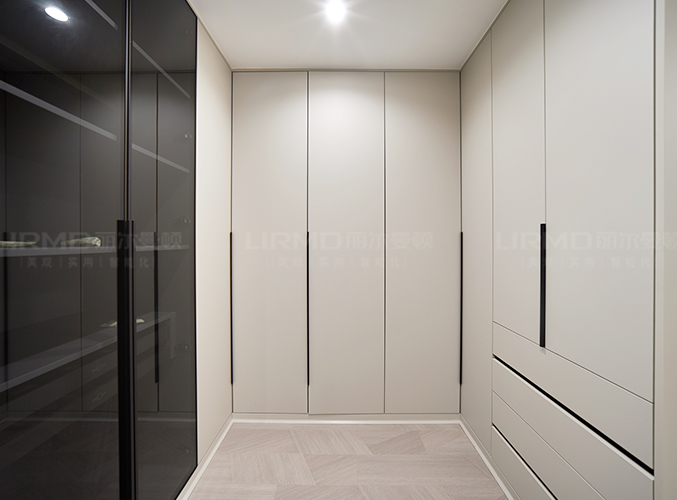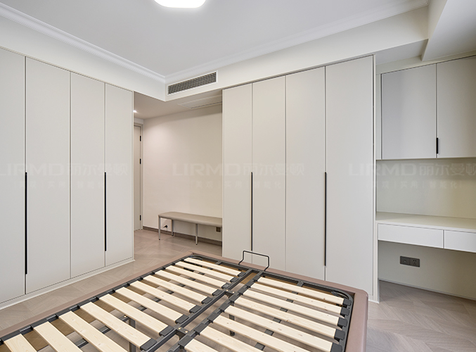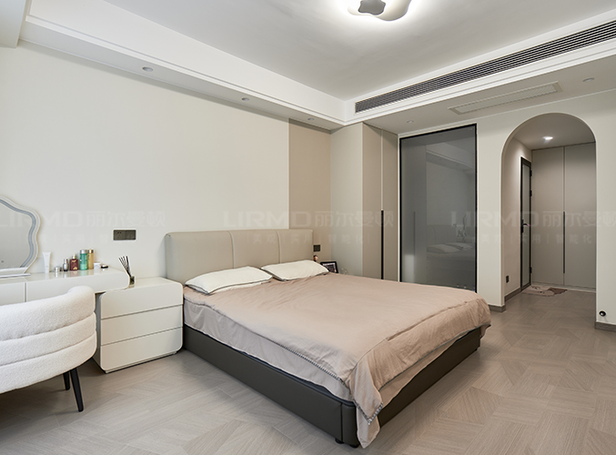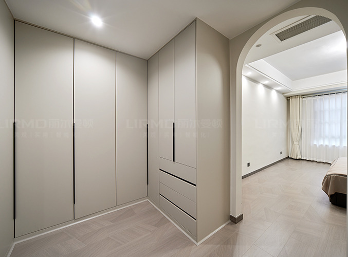 臥室拱形門分割衣帽間,滿墻衣柜實(shí)現(xiàn)門墻柜一體化,整體統(tǒng)一高級(jí)。