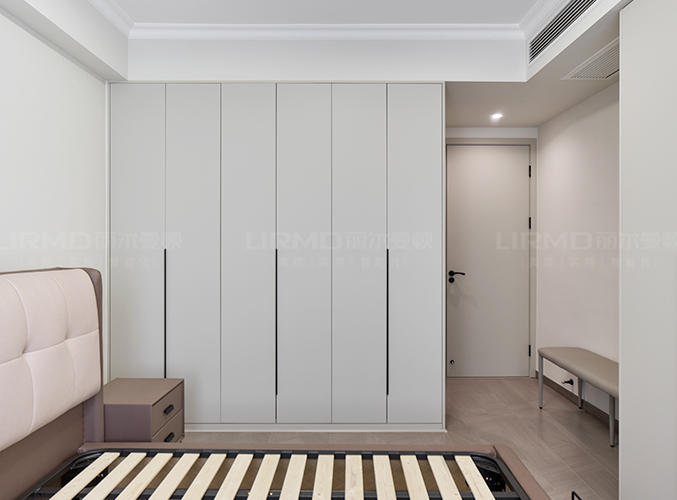 實(shí)木柜體搭配PET膚感柜門,多組一門到頂衣柜+床頭柜的組合,收納更加方便。