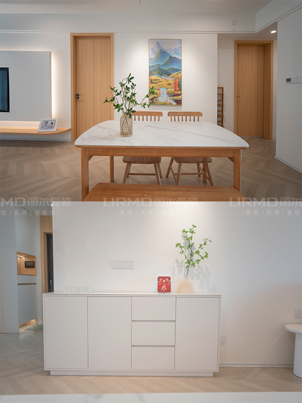 整體將原木風貫徹到底,房門、衣柜、餐桌一體化設計,超級溫馨。