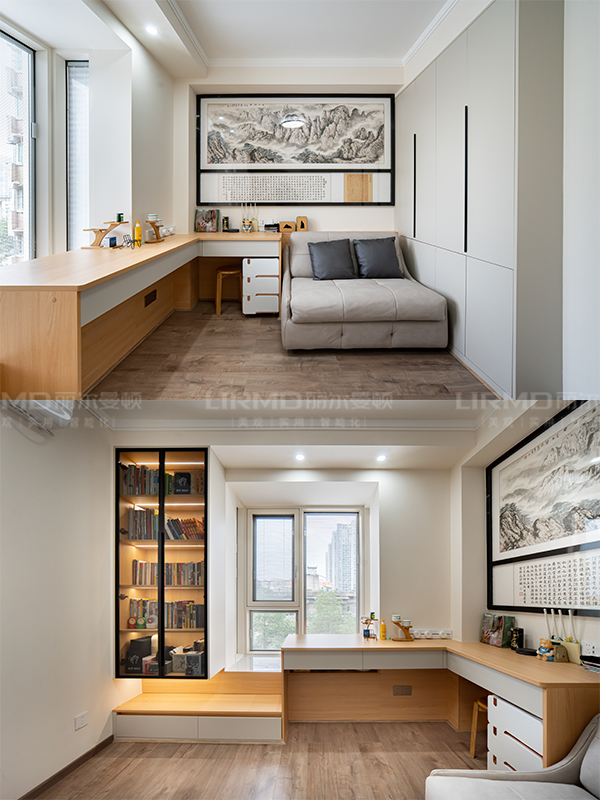 門墻柜一體化設計,打造全屋同款同色同造型,書房運用玻璃柜門的設計,美觀的同時實用感也很絕