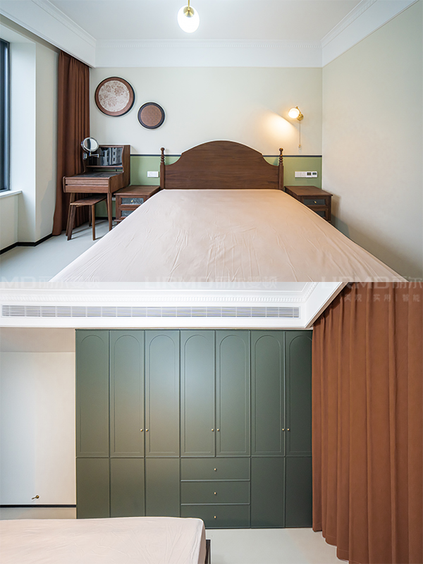 全屋用復古綠與奶咖色做撞色,融入花磚設計,整體充滿故事感
