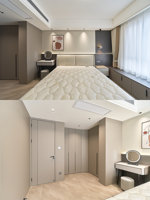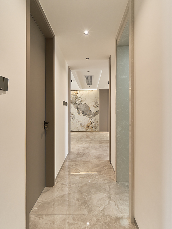 門墻柜一體化,柜子濟州灰與木卡其的搭配為整個空間的主色調,地面磚的大理石灰為基礎色調