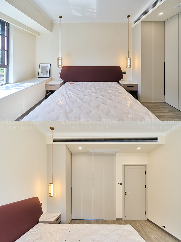 次臥書桌和衣柜一體化設(shè)計,既滿足了床頭收納的需求,又增加了收納空間