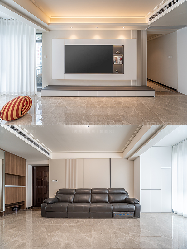 電視背景墻打破傳統(tǒng)形式,懸于半空,延伸出墻體之外,為空間帶來更多的自由和開放感