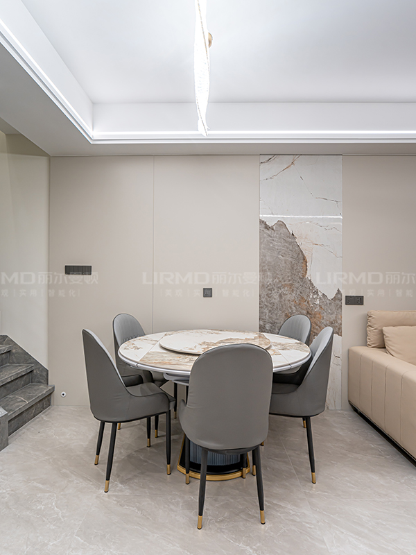 嵌入式轉墻冰箱柜、玄關疊級造型、潘多拉巖板上墻,電視背景墻以及整墻配套同色沙發背景