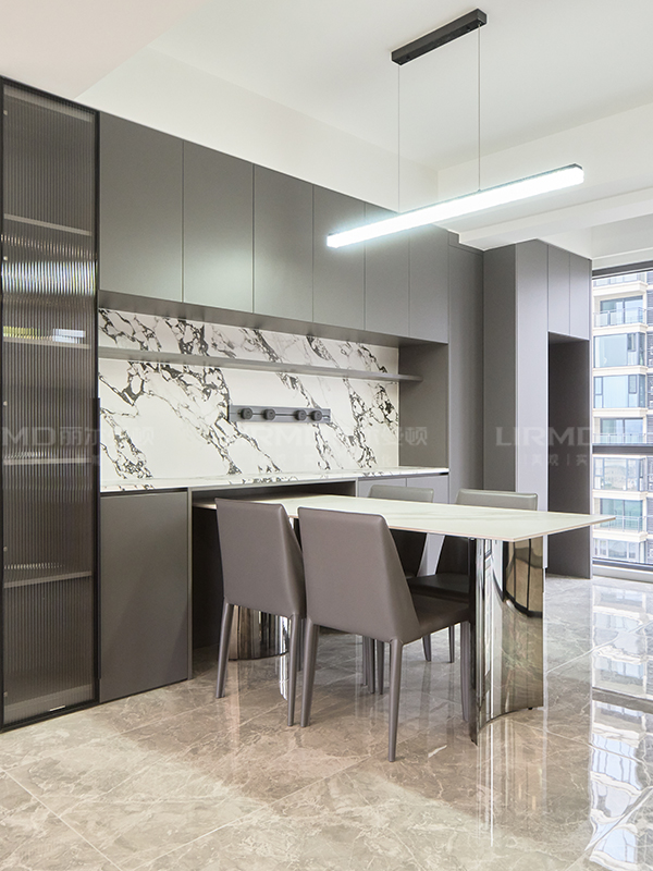 全房配色極具特色,客餐廳深色的柜體柜門,彰顯著與眾不同的審美