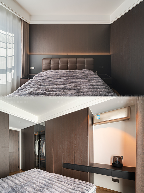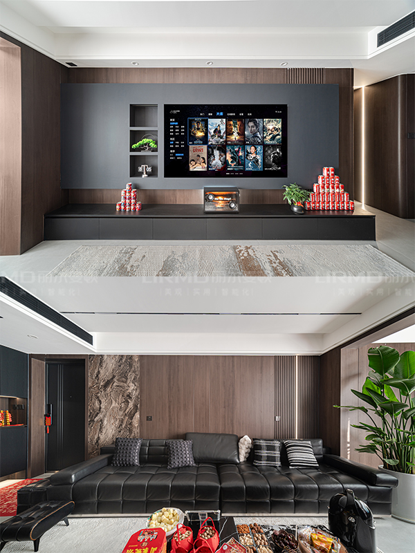深棕木色和質感黑打底+局部綠植點綴,隱藏燈帶提亮,沉穩又不失精致感,隨便拍都是氛圍感大片